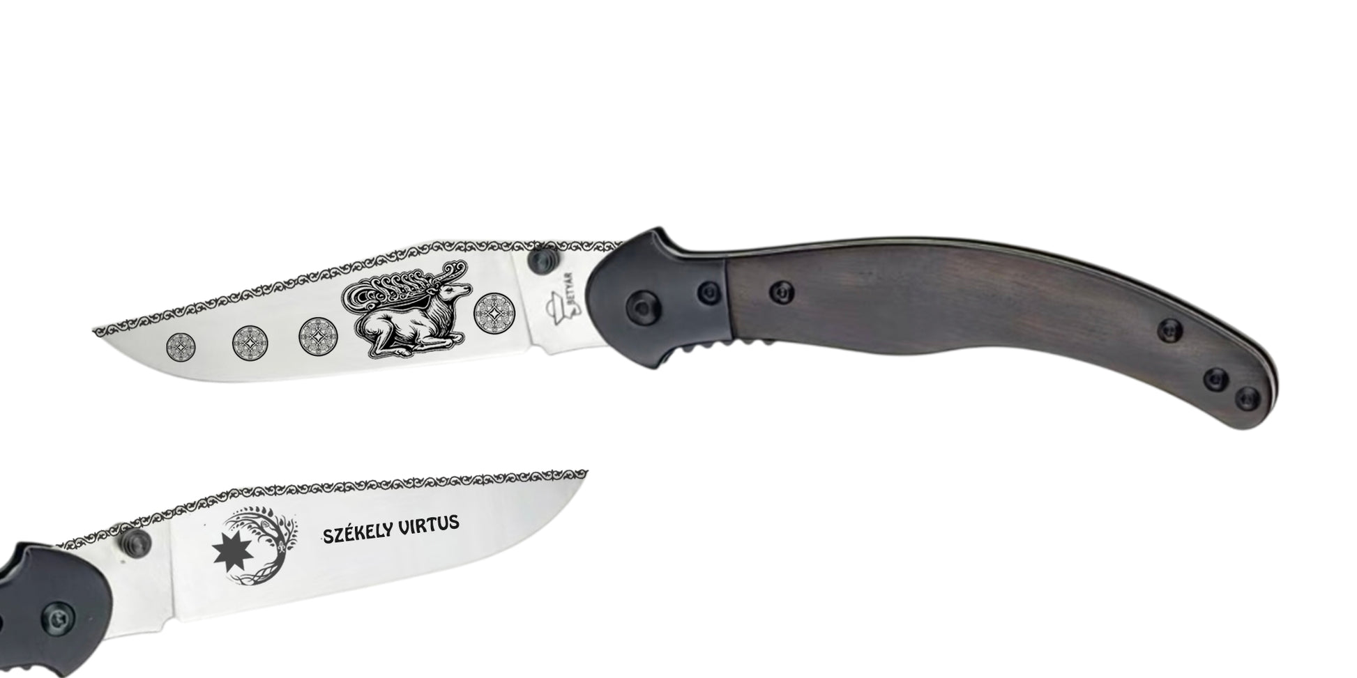 Nálunk nem kell kompromisszumot kötnöd: megvalósítjuk az elképzelésedet pontosan úgy, ahogy szeretnéd. Legyen szó zenekari logóról, céges arculatról, egyedi mintáról vagy akár egy teljesen saját, kreatív ötletről, mi életre keltjük a pengén.