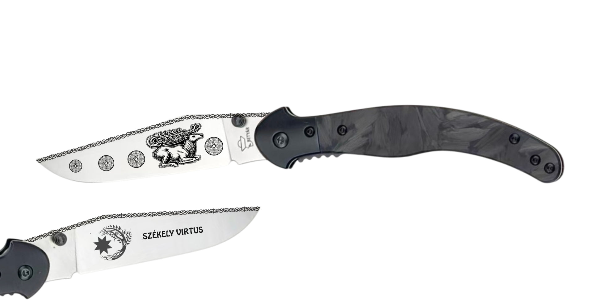 Nálunk nem kell kompromisszumot kötnöd: megvalósítjuk az elképzelésedet pontosan úgy, ahogy szeretnéd. Legyen szó zenekari logóról, céges arculatról, egyedi mintáról vagy akár egy teljesen saját, kreatív ötletről, mi életre keltjük a pengén.